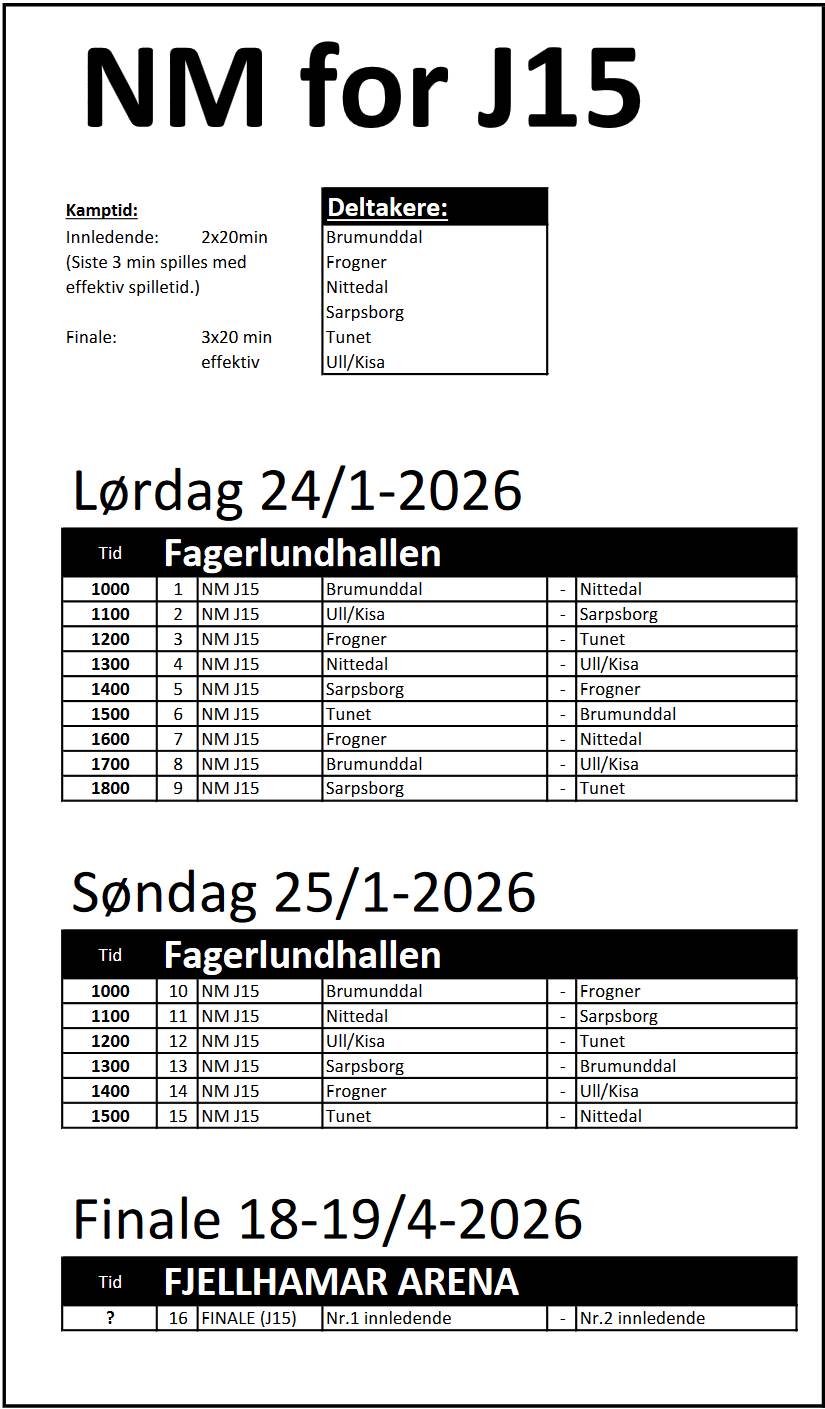 NM for Jenter 15 vil bli spilt i Fagerlundhallen i Brumunddal helgen 24. – 25. januar 2026.