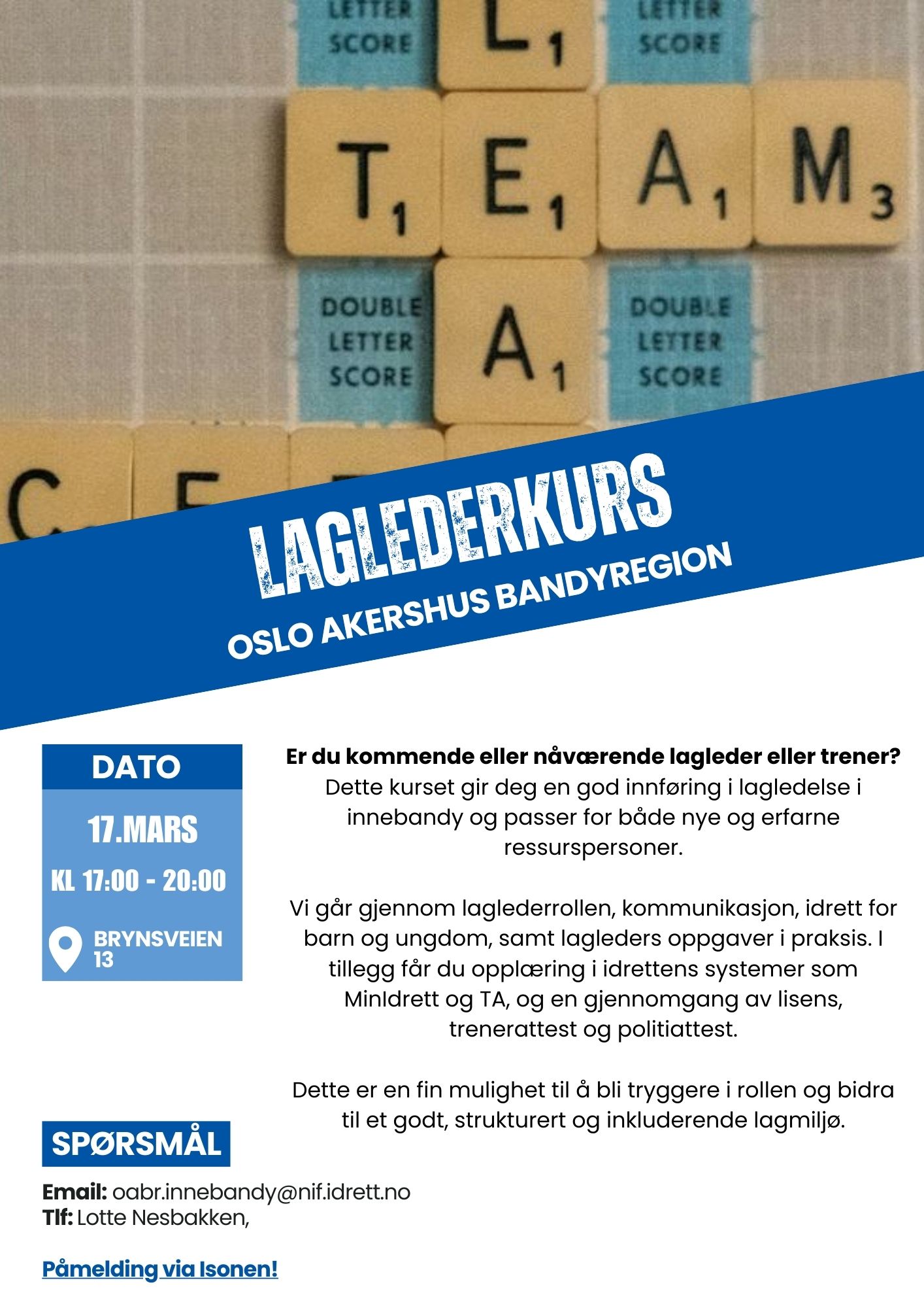 Er du nåværende eller kommende lagleder eller trener? Dette kurset gir en god innføring i laglederrollen i innebandy og passer både for nye og erfarne ressurspersoner. Her går vi gjennom laglederrollen, kommunikasjon, idrett for barn og ungdom, samt lagleders oppgaver i praksis. Deltakerne får også en introduksjon til systemer som MinIdrett og TA, samt informasjon om lisens, trenerattest og politiattest. Målet er å gjøre deg tryggere i rollen og bidra til et godt og inkluderende lagmiljø.